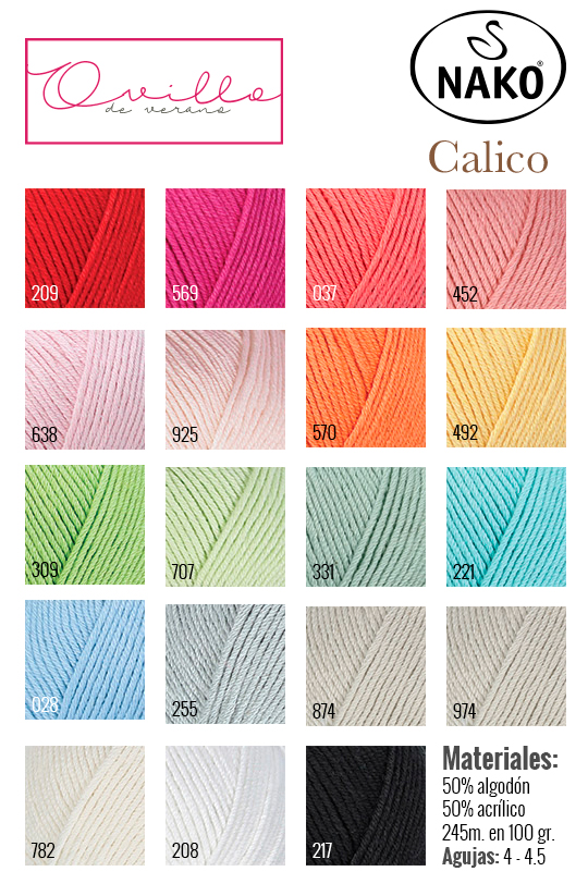Calico BELLO HILO DE VERANO Categorías: ALGODÓN, HILO, VERANO Descripción Descripción Materiales: 50% Acrilico, 50% Algodon Peso: 100 grs 245 m Agujas: 4-4.5 Crochet: 2 Productos relacionados Leer más SERIDO INDUSTRIAL DE VERANO Leer más COTTON